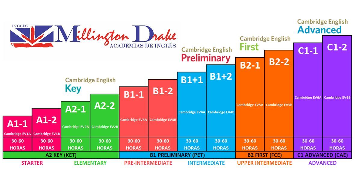 Los cursos de inglés online se dividen según los estándares del Marco Común Europeo, desde el nivel más básico, A1 hasta el nivel correspondiente al C1, en 12 niveles.